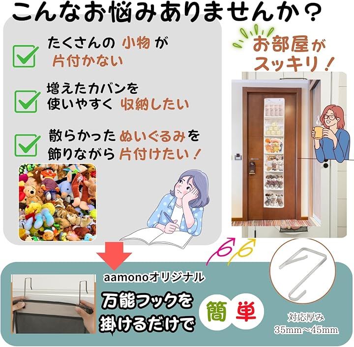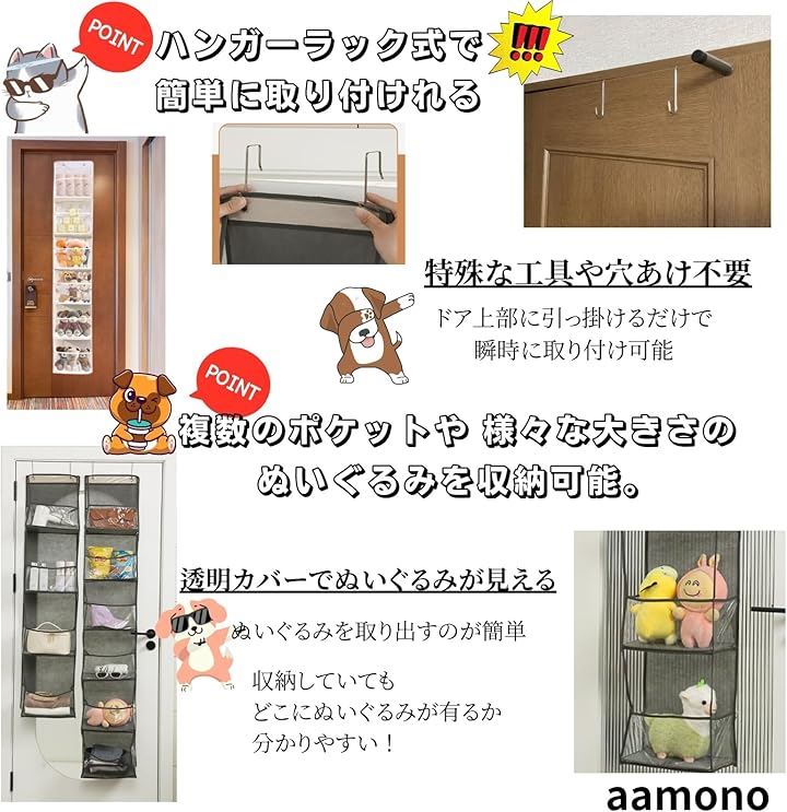 「aamonoのぬいぐるみ収納」は、 ドアにフックで簡単にかけるだけ で、 ぬいぐるみをかわいく収納できる優れもの。 簡易梱包にて出荷します、ご了承ください。