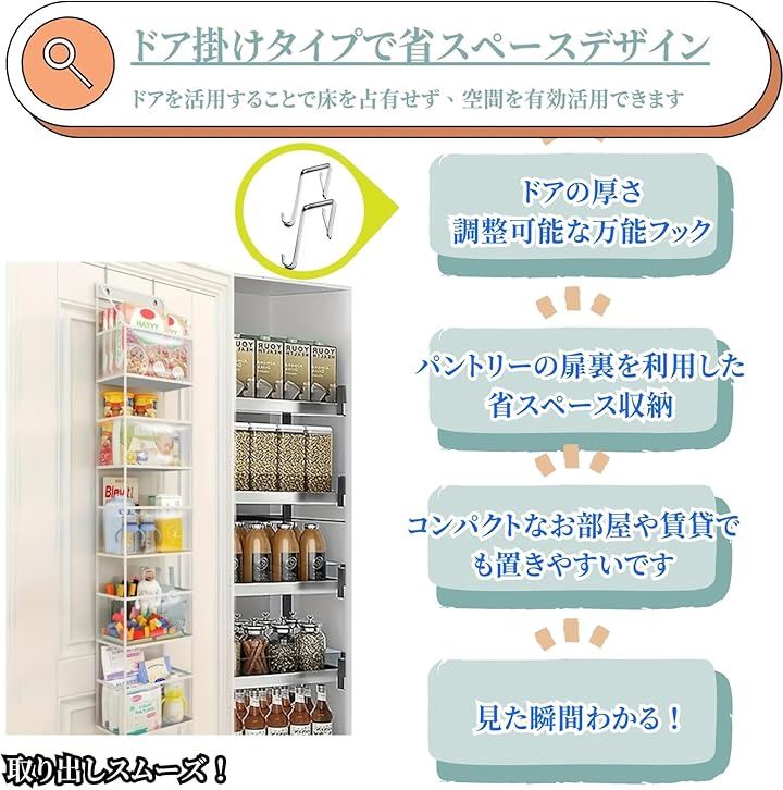 面倒な組み立てや、壁に穴を開ける必要は一切なし。付属のフックをドア枠に引っ掛けるだけで、誰でも簡単に設置完了。 賃貸住宅にお住まいの方にも安心してお使いいただけます。