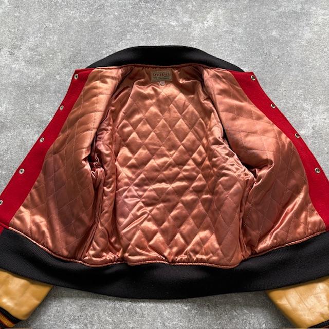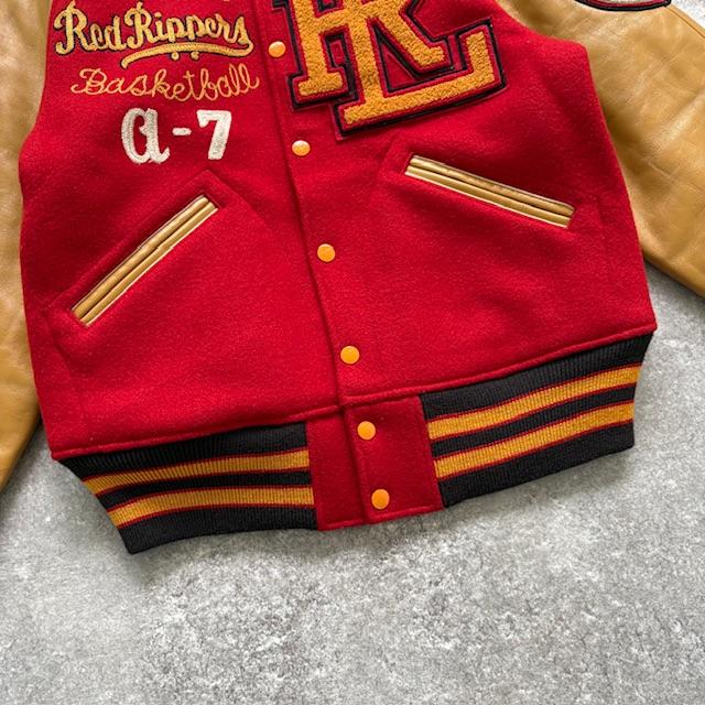 The deep red wool body combined with camel leather sleeves makes this a perfect representation of an authentic American varsity jacket.
