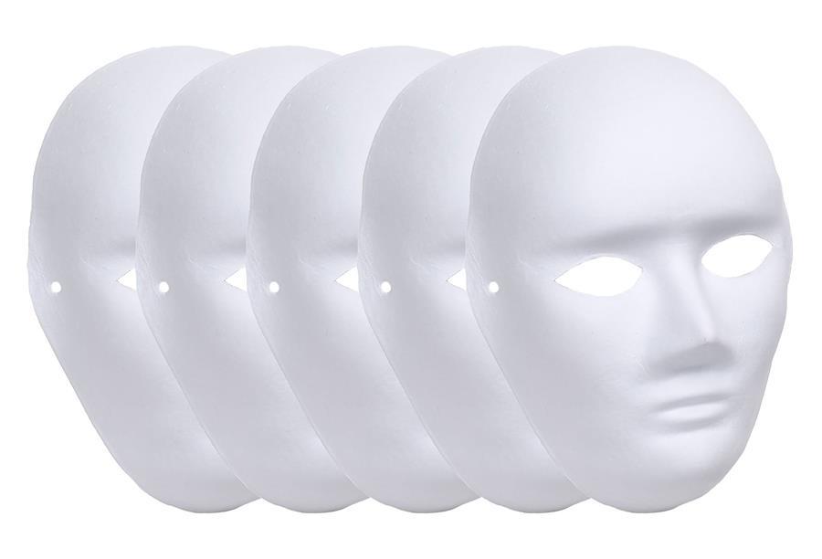 紙パルプ製の丈夫な無地お面です サイズ(約):男性タイプ;横幅19cm×縦幅24cm(※写真参照) カラー:ホワイト 材質:紙パルプ耐圧紙 セット内容:お面×5、ゴム紐×5、保証書