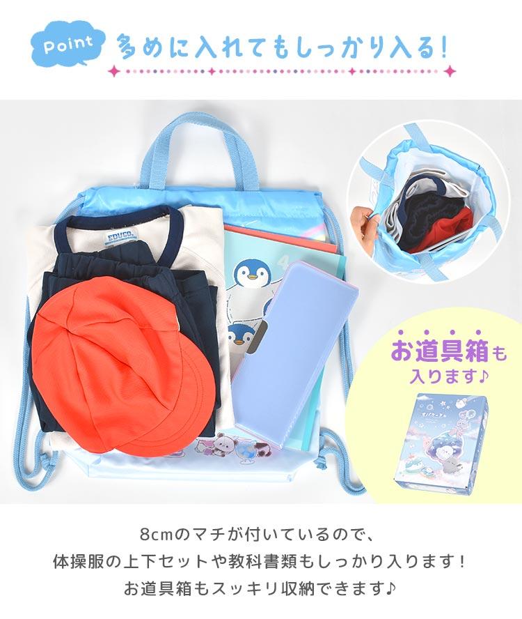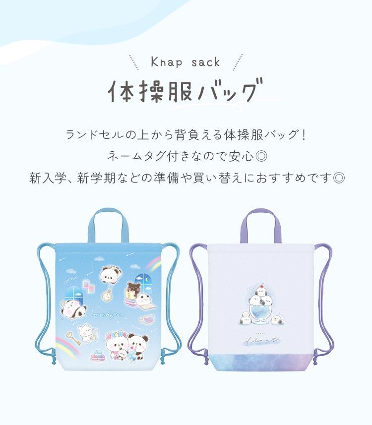 【体操服バッグ】ランドセルの上から背負えるナップサック型のバッグ。乾きやすくさらっとしたポリエステル素材。内側にネームラベルがついているので紛失防止にも◎8cmのマチがついているので体操服だけでなく教科書やノートもしっかり収納できます。人気のもちもちぱんだやしまえなが柄で子どもが嬉しいバリエーショn♪新入学、新学期などの準備や買い替えにおすすめです。