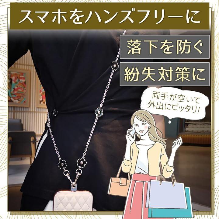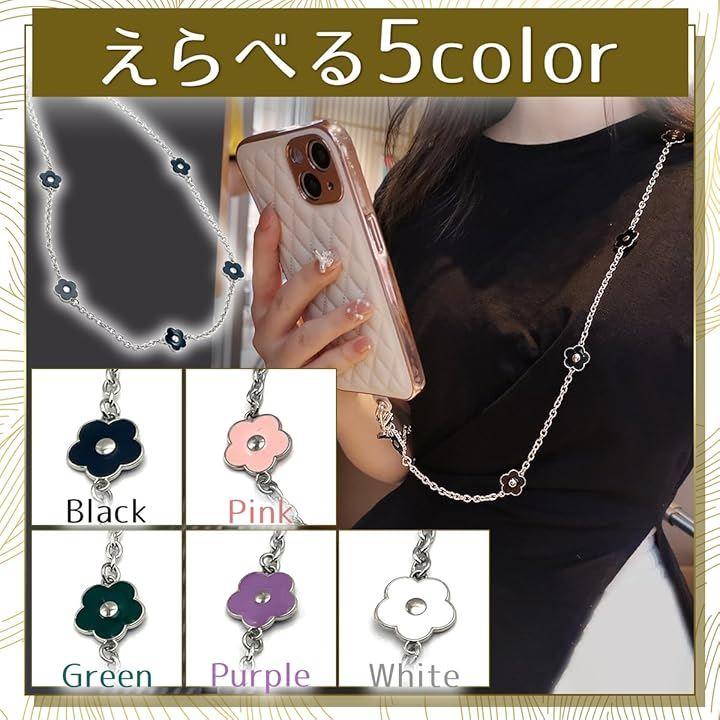 「かわいく持ち歩くスマホショルダー チェーン 細め 花柄」細めチェーンx花柄の絶妙バランスが10代・20代女子に大人気。ファッションに合わせて選べる5色(ブラック、ピンク、グリーン、パープル、ホワイト)で、スマホもアクセ感覚で楽しめる。