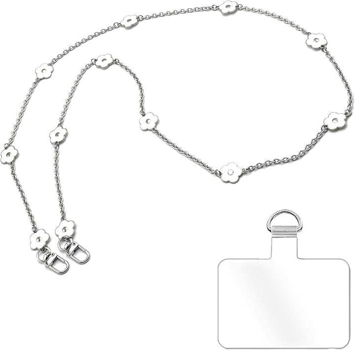 「チェーンストラップ スマホ 全機種対応 かわいい」トレンドのシルバーチェーンに花柄パッチを組み合わせた、超かわいいスマホストラップ。