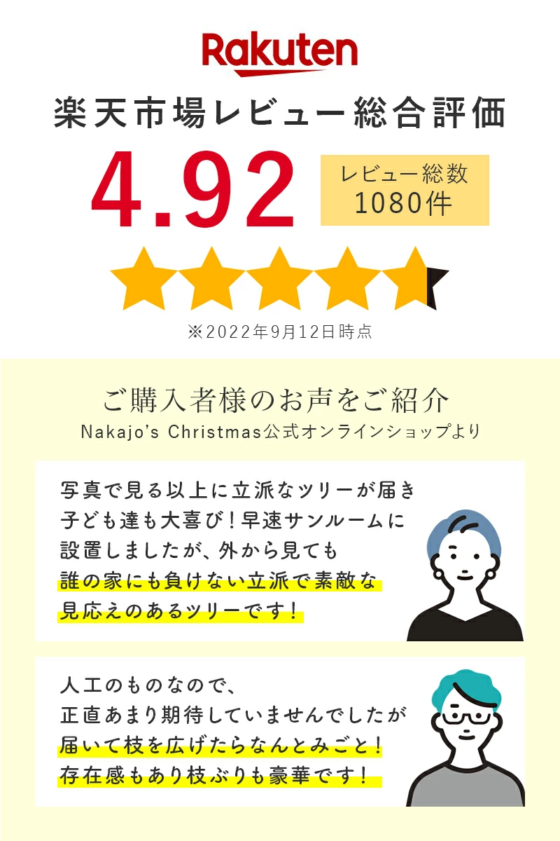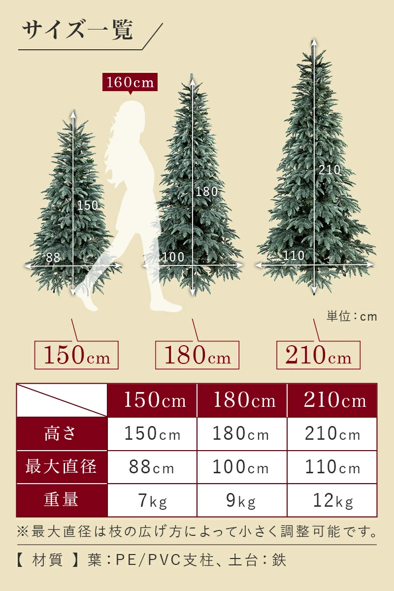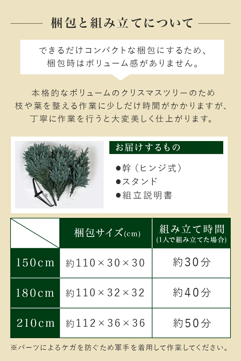 ●高さ:約210cm●枝を広げたときの最大横幅:約110cm●総重量:約12Kg●幹は3分割+スタンド●梱包箱のサイズ:112cmx36cmx36cm●組立作業時間の目安(1人で作業した場合)組立+枝を広げる作業:約50分