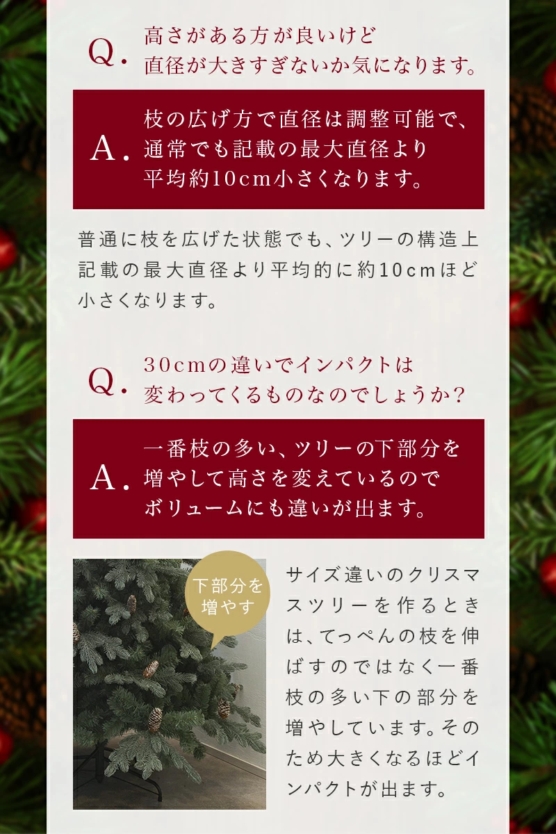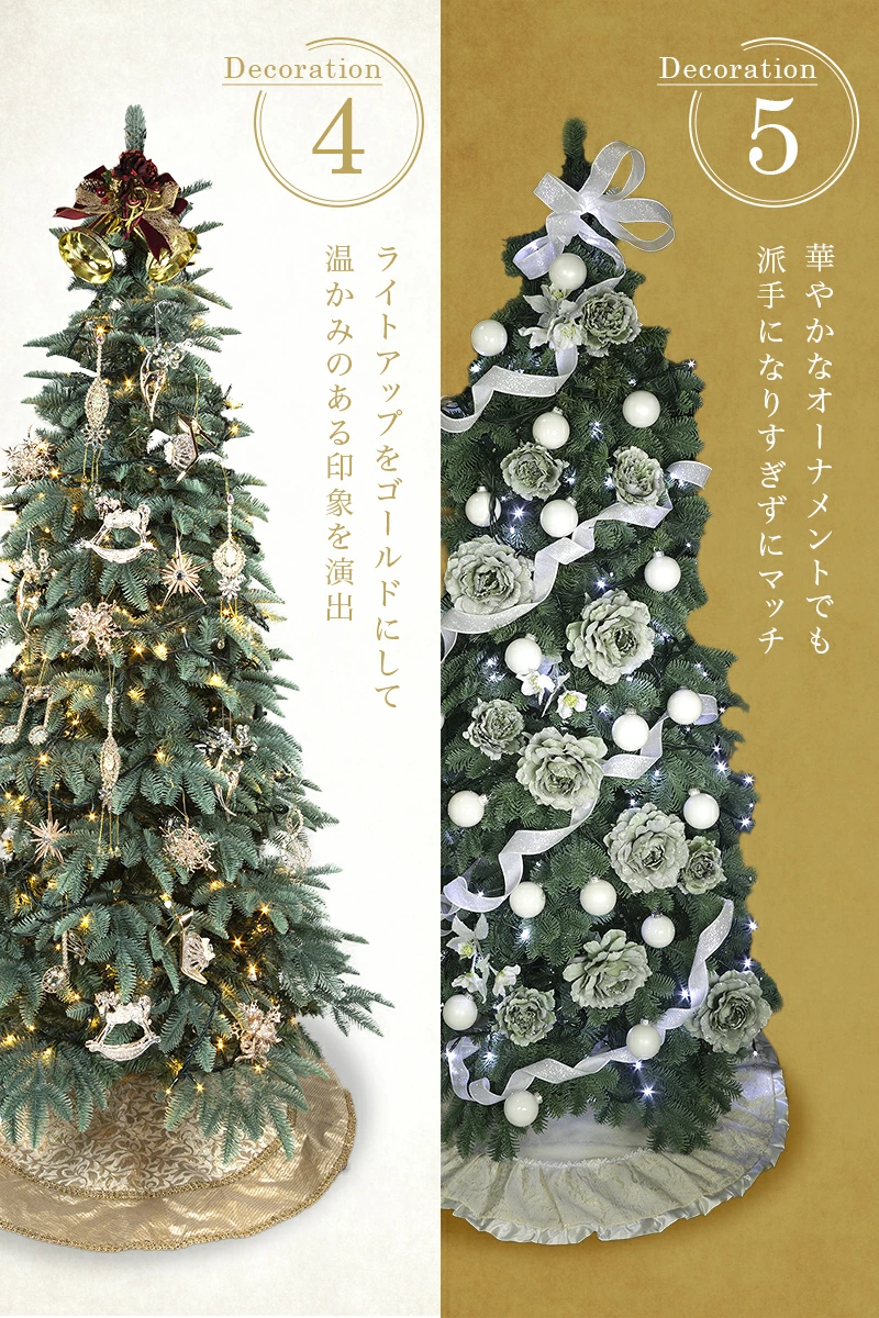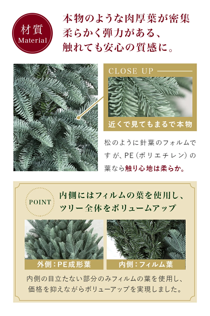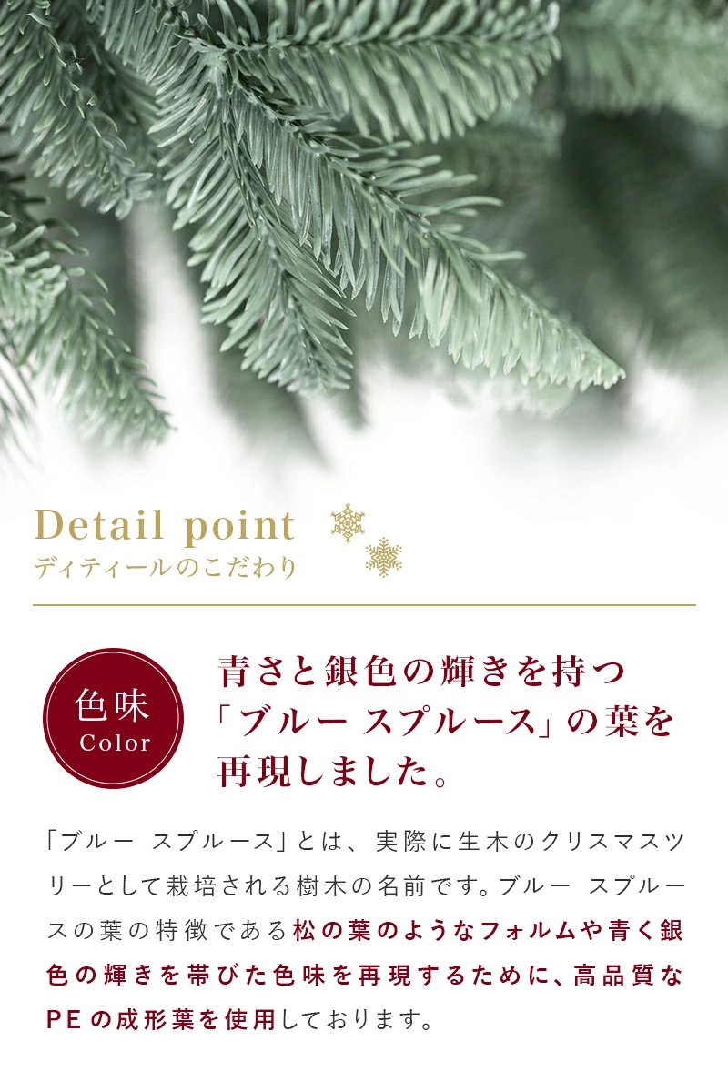 多くのクリスマスが大好きなお客様より『ブルー・スプルース、ホプシーのような人工クリスマスツリーが欲しい』というご要望が寄せられておりました。つまり、葉先がフィルム葉ではなく、もっと本物っぽいもので、色は青銀色で・・・なかなか難しいご要望でしたが、数年かけて発売にこぎつけました。まずは、葉先の詳細写真をご覧ください。本物のような肉厚の葉が密集しております。また、ポリ成型の葉ですので、柔らかく弾力があり、リアルで安全。オーナメントとの調和とクリスマスらしさの観点から実際のブルー・スプルースよりも青みを押さえ、緑を若干濃くしています。全体のフォルムはきれいな前下がりのヨーロピアンスタイルで、落ち着いた上品さを演出しています。発売と同時に大変な反響を呼ぶとともに、スリム化を実現し、日本のあらゆるご家庭で飾りやすいサイズをご用意しました。スリム系ツリーですが、単に細くしたのではありません。北欧などの寒い地方の木々は遠目に見れば縦長のフォルムをしているものが多く存在しています。おそらくそれが北欧らしい景色をイメージする一因なのでしょう。その遠目に見た樹木のフォルムに特長であるトップから裾まで弧を描くように広がり足元まで枝が張っている様子をうまく組み合わせて、北欧の風景の一部みたいに美しいツリーを完成させました。