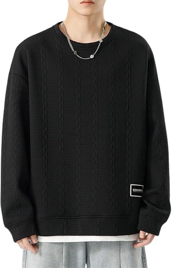襟元と裾がレイヤード風になっているフェイクレイヤードデザイントレーナー ニットのようなケーブル編みの凹凸があるエンボス素材なのでこなれ感のある大人なカジュアルスタイルにオススメのメンズ長袖トレーナー。
