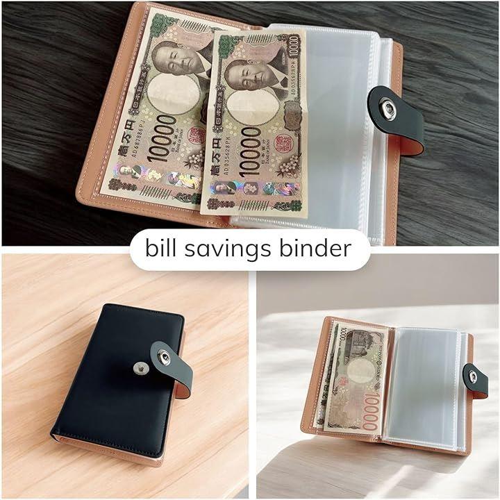 シンプルにお札を収納するためのおしゃれバインダー、クリアシートにお札が溜まっていき、お札貯金が進むにつれてテンションが上がっていきます。お札を1シートに1枚入れてお札が100枚入ります、10,000円札を100枚入れれば100万円貯金...