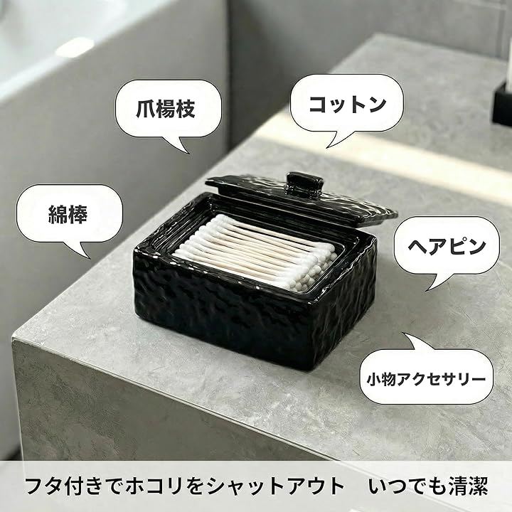 綿棒や爪楊枝などの小物をお洒落に収納でき、洗面所やリビング、デスク周りを上質な雰囲気に演出します。