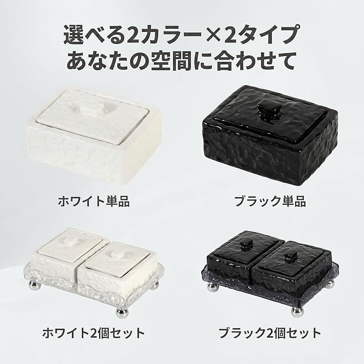 「選べる2タイプx2カラー」単品(W10xD7.7xH3.8cm・約350g)とクリアトレー付き2個セット(W18xD12xH7cm・約800g)をご用意。