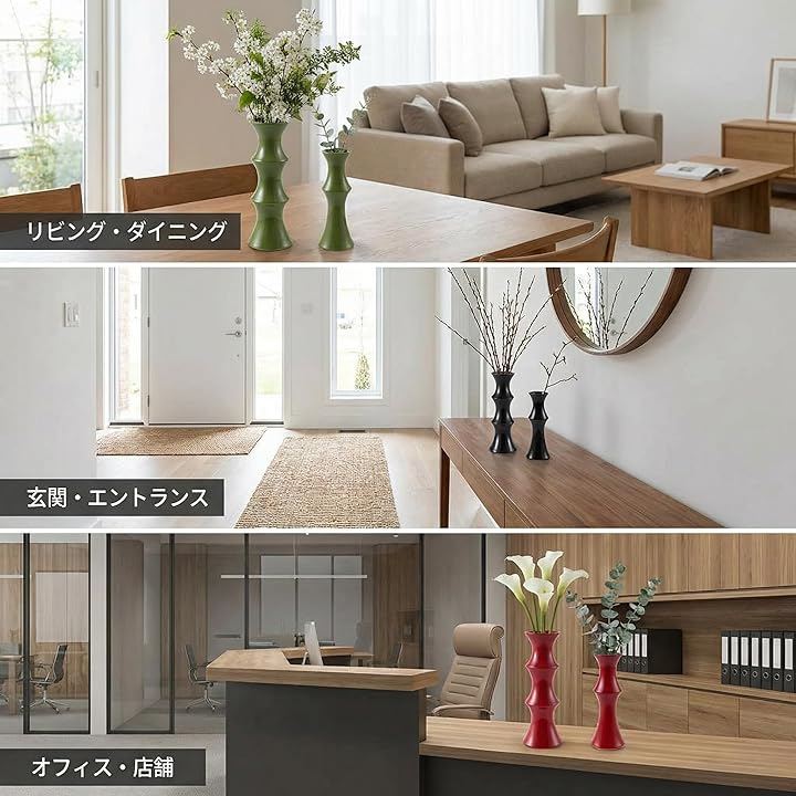 「サイズとカラー詳細」 大:高さ25.5cmx口径7cmx底径9cm/小:高さ20cmx口径5.5cmx底径8cm、素材:セラミック(陶器)、カラー展開:ホワイト・グリーン・ブラック・レッドの4色でお部屋の雰囲気に合わせて選択可能です。