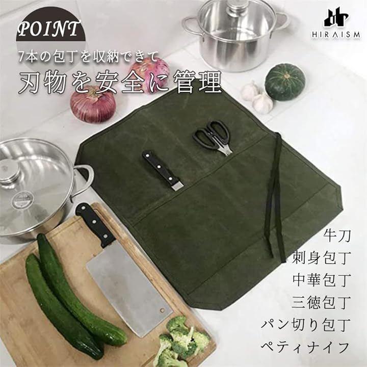 7本の包丁を収納できる広々としたポケットで、刺身包丁、中華包丁、三徳包丁、パン切り包丁、牛刀、ペティナイフなど、さまざまな包丁に対応。