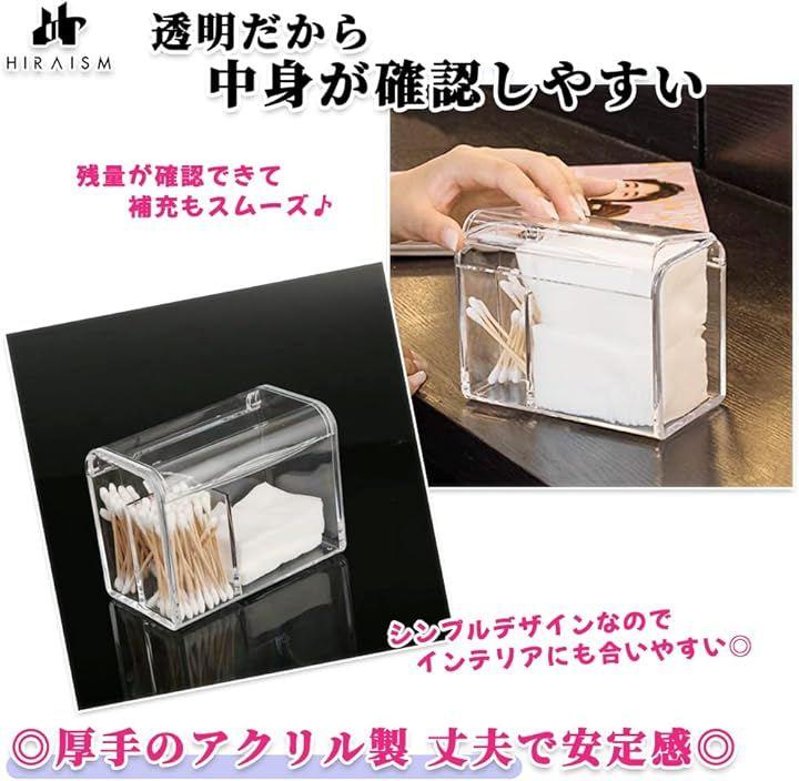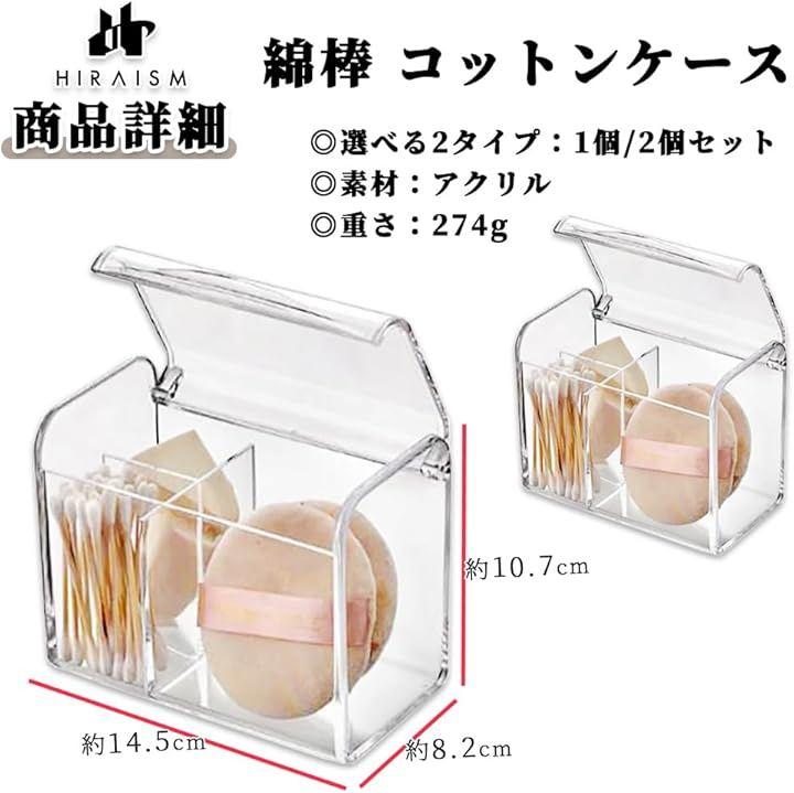 「商品内容」綿棒 コットンケース;2個 カラー:クリア 素材;アクリル製 サイズ:幅14.5cm 奥行8.2cm 高さ10.7cm 重量:274g / 個
