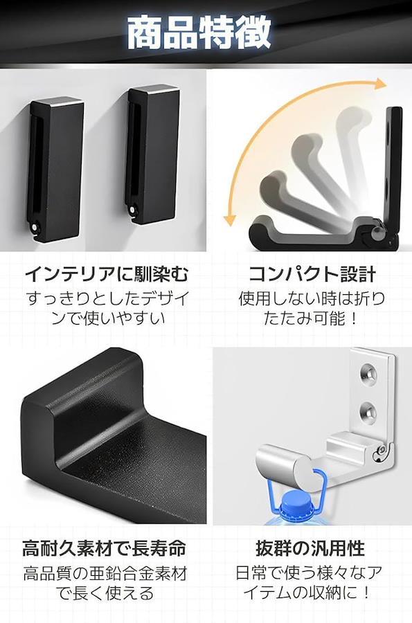 「商品特徴」(1)インテリアに馴染む:すっきりとしたデザインで使いやすい/(2)コンパクト設計:使用しない時は折りたたみ可能。/(3)高耐久素材で長寿命:高品質の亜鉛合金素材で長く使える/(4)抜群の汎用性:日常で使う様々なアイテムの収納に。