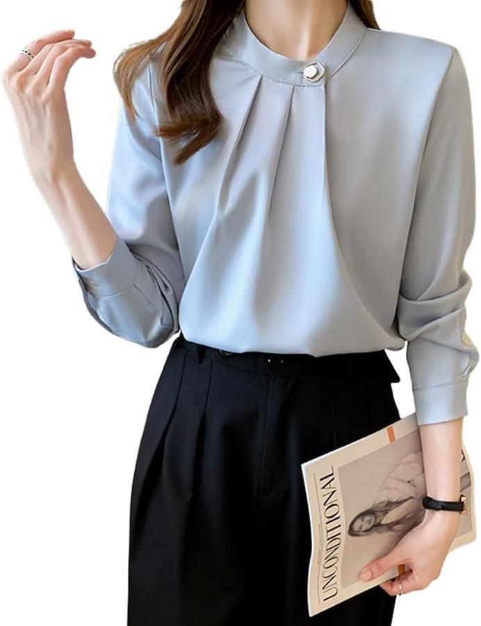 「特徴(1):パール付きでエレガントなアクセント」襟元には上品な輝きを放つパール付きブラウス仕様で、顔まわりを明るく華やかに見せてくれます。