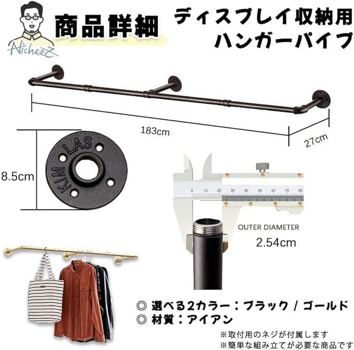 「商品内容」 ディスプレイ収納用ハンガーパイプ 材質:アイアン カラー:ブラック/ゴールド サイズ:幅/183cm 奥行き/約27cm *取り付け用のネジが付属します。