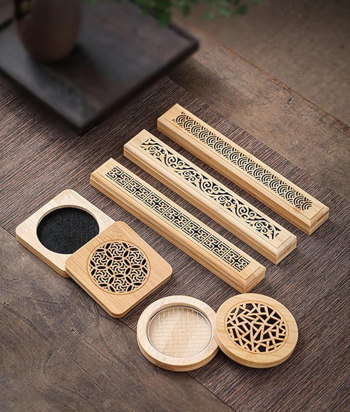 デザイン性: 伝統的な和風の透かし彫り模様が施された木製お香立て、3種類の異なる模様からお選びいただけます