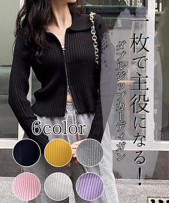 ジップアップと襟がポイントのリブニットカーディガンです。