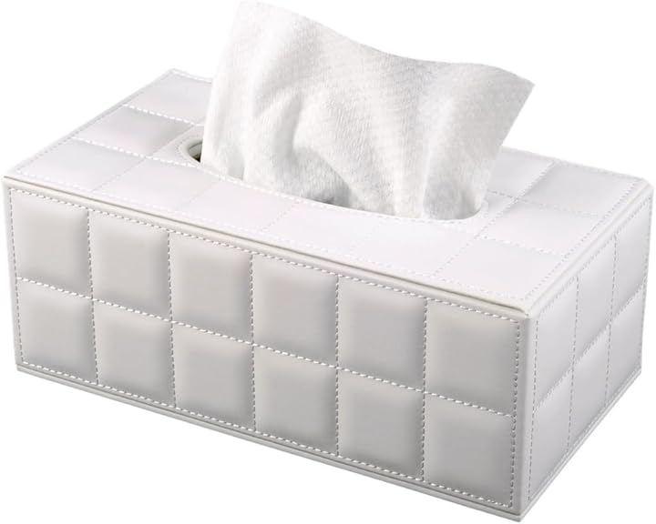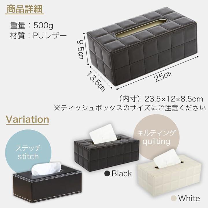 「商品詳細」サイズ:(外寸)25x13.5x9.5cm (内寸)23.5x12x8.5cm 重量:500g 材質:PUレザー カラー:ブラック/ホワイト *ティッシュボックスのサイズによっては収納できない場合がございますので、ご購入前にサイズをご確認ください。