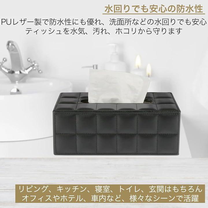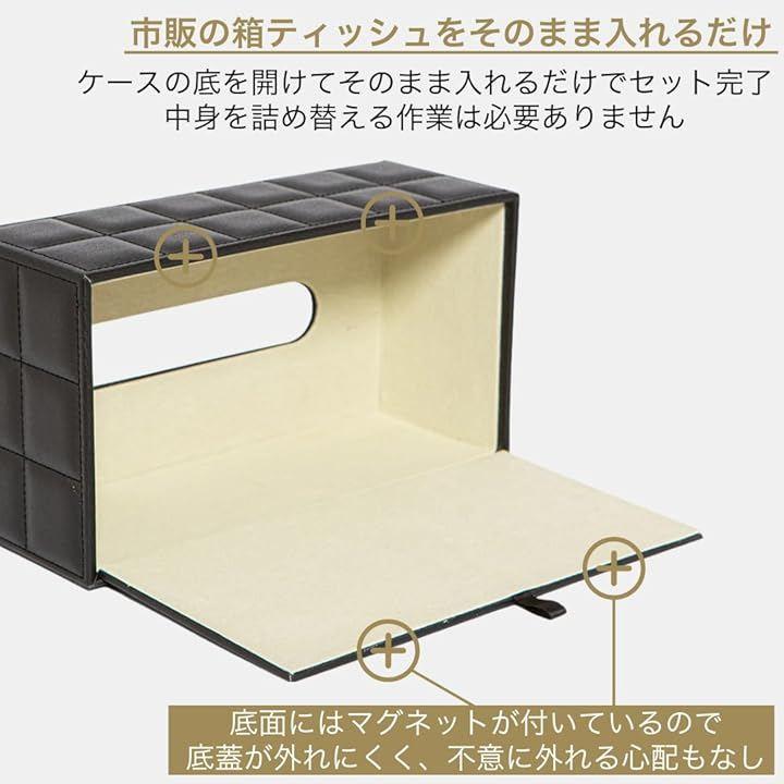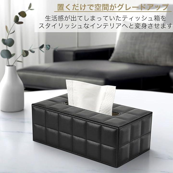 「商品詳細」サイズ:(外寸)25x13.5x9.5cm (内寸)23.5x12x8.5cm 重量:500g 材質:PUレザー カラー:ブラック/ホワイト *ティッシュボックスのサイズによっては収納できない場合がございますので、ご購入前にサイズをご確認ください。