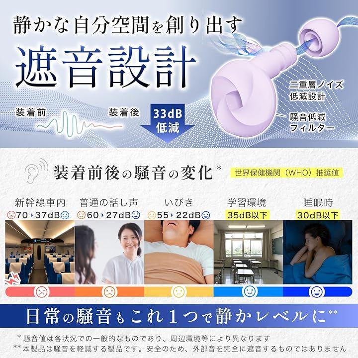 「自分空間を創り出す遮音設計」iYUZUの耳栓は、スタイリッシュかつ独自の二重層ノイズ低減設計により、いびきや話し声などの日常の騒音をしっかり軽減(-33dB)してくれます。