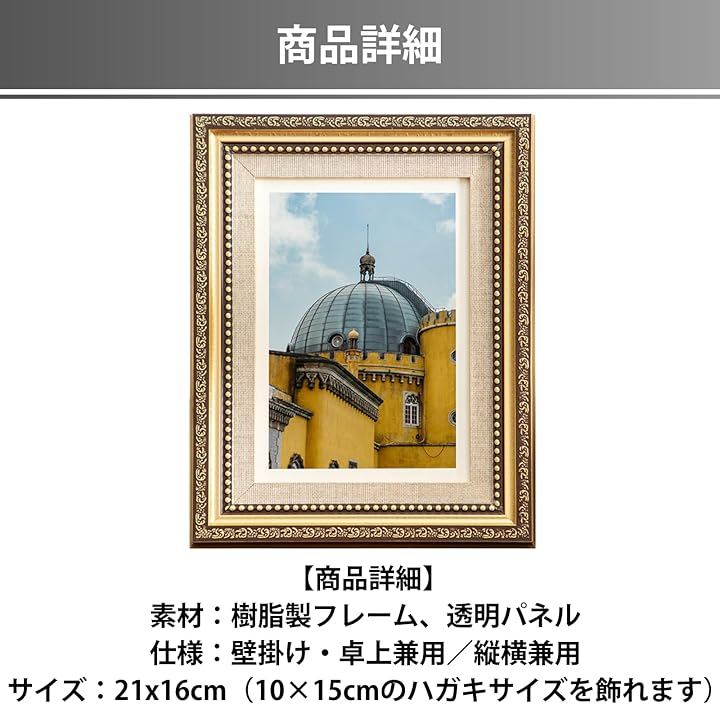 「商品詳細」素材:樹脂製フレーム、透明パネル 仕様:壁掛け・卓上兼用/縦横兼用 サイズ:21x16cm(10x15cmのハガキサイズを飾れます)