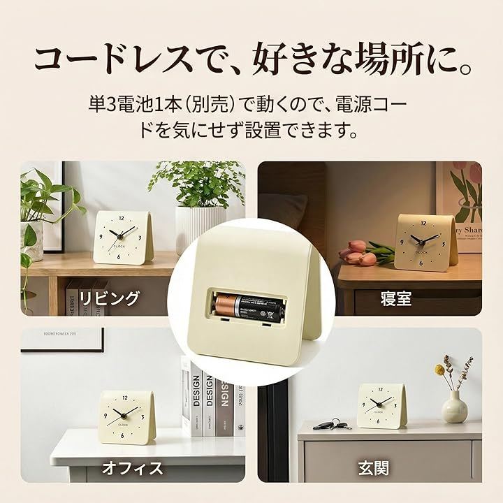 リビングの棚、玄関、オフィスなど電源コード不要でどこでも設置でき、時間確認がスムーズになることで忙しい毎日をサポートします。