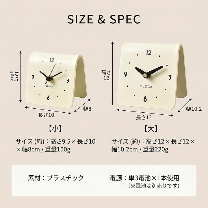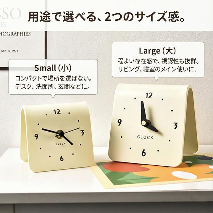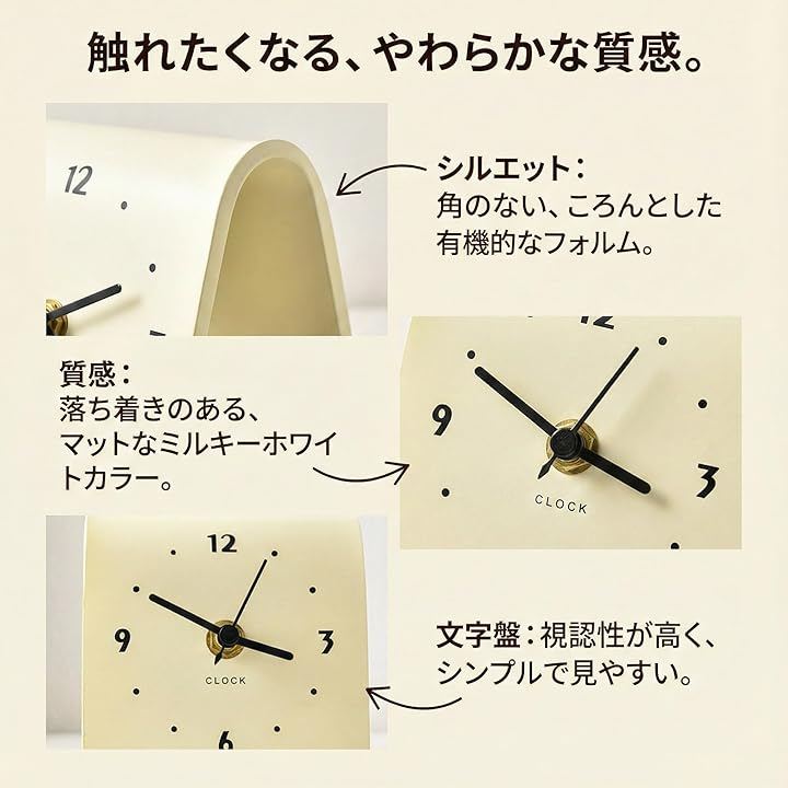 「商品説明」やわらかな曲線シルエットが目を引く、ミニマルデザインの置き時計。