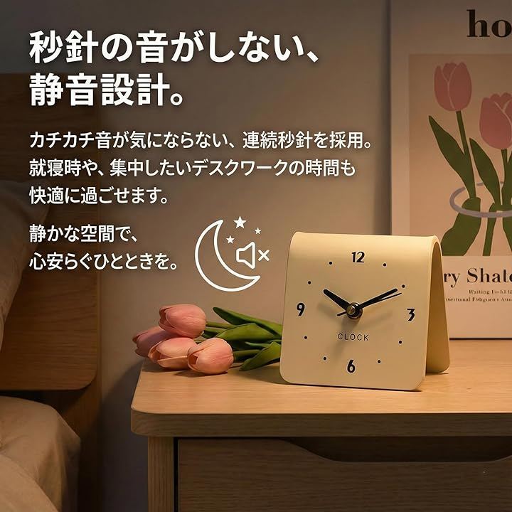 秒針のカチカチ音がしない静音設計で、寝室のベッドサイドや集中したいデスクワークでも音を気にせず快適。