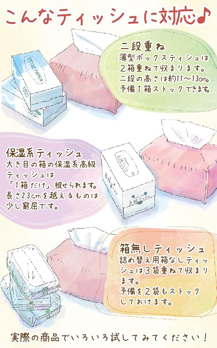 ティッシュカバーの高さが13cmあるので高さ厚型のボックスティッシュにも対応しています。