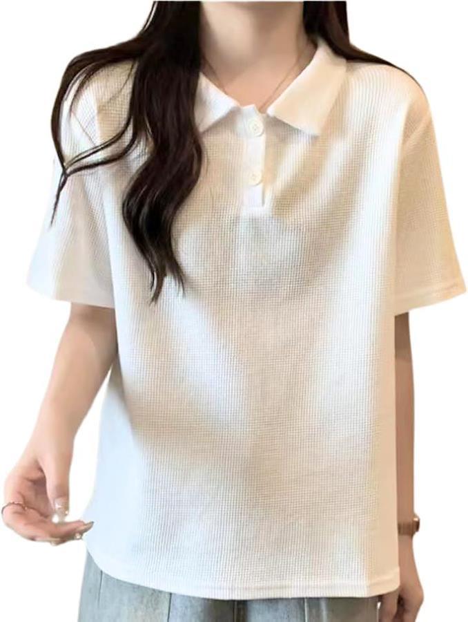 「特徴(1)」ぽろシャツ半袖 レディースは、ワッフル生地のポロシャツに白いボタンがアクセントとなり、ボタンや襟が可愛いシンプルながらも洒落感のあるデザイン。