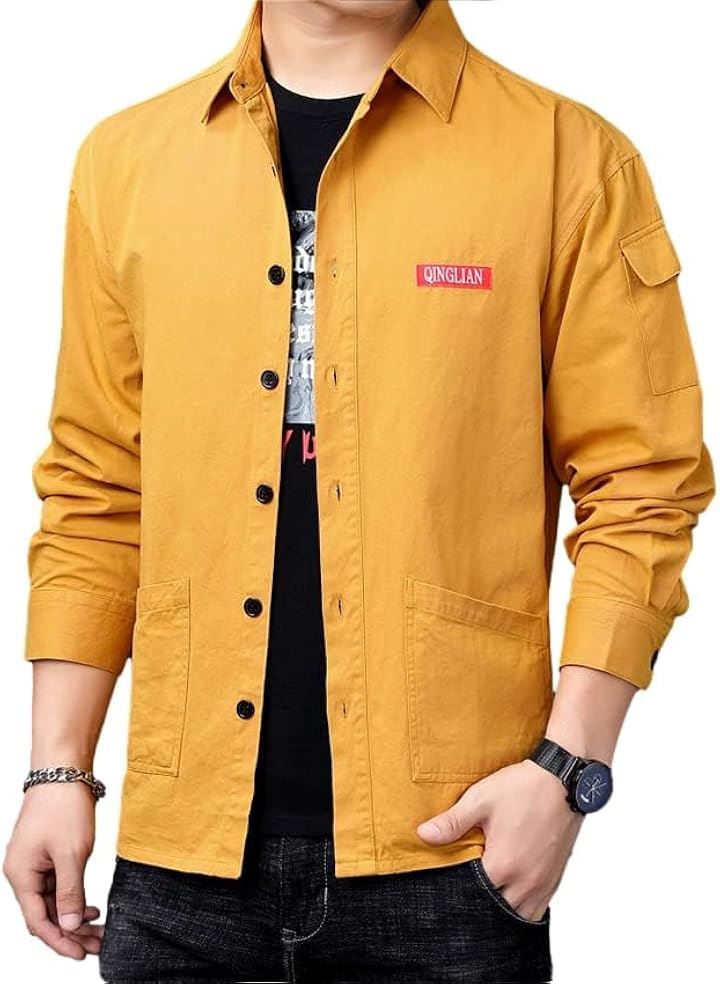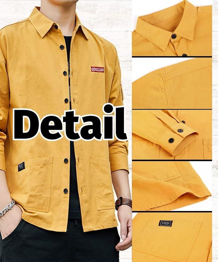 Stylish work shirt for men, long sleeves, top, large size, spring, autumn, winter, casual, outerwear, simple, with collar, double pockets, plain, cotton, 100%