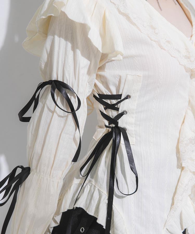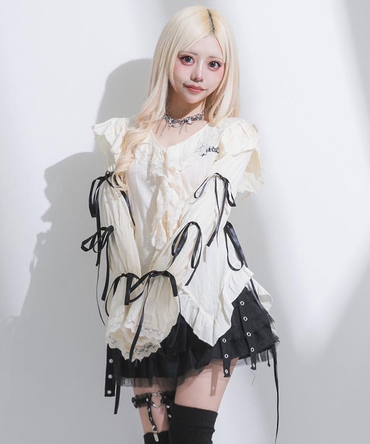 胸元から袖、襟までたっぷりフリルで、もう視線ぜんぶかっさらい確定。