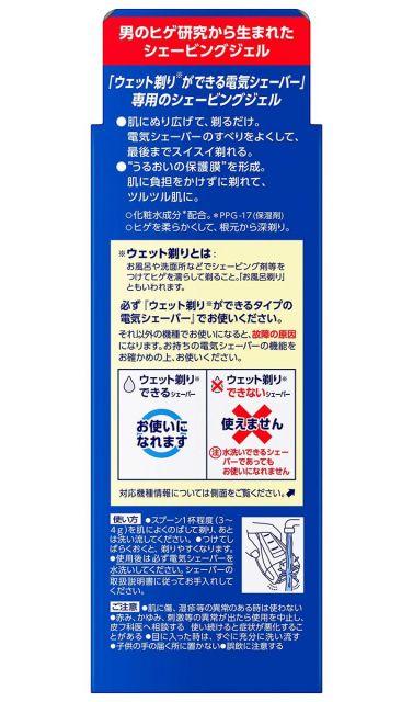 商品紹介電気シェーバーでもヒリヒリする方に。ウェット剃りができる電気シェーバー専用のシェービングジェル。肌にぬり広げて、剃るだけ。電気シェーバーのすべりをよくして、最後までスイスイ剃れます。“うるおいの保護膜"を形成。肌に負担をかけずに剃れて、ツルツル肌に。化粧水成分*配合。ヒゲを柔らかくして、根元から深剃りできます。●電気シェーバー用(ウェット剃り専用)*PPG-17(保湿剤)原材料・成分●成分:水、エタノール、PPG-17、(アクリレーツ/アクリル酸アルキル(C10-30))クロスポリマー、メントール、水酸化Na、フェノキシエタノール、メチルパラベン、エチルパラベン、EDTA-2Na、香料)