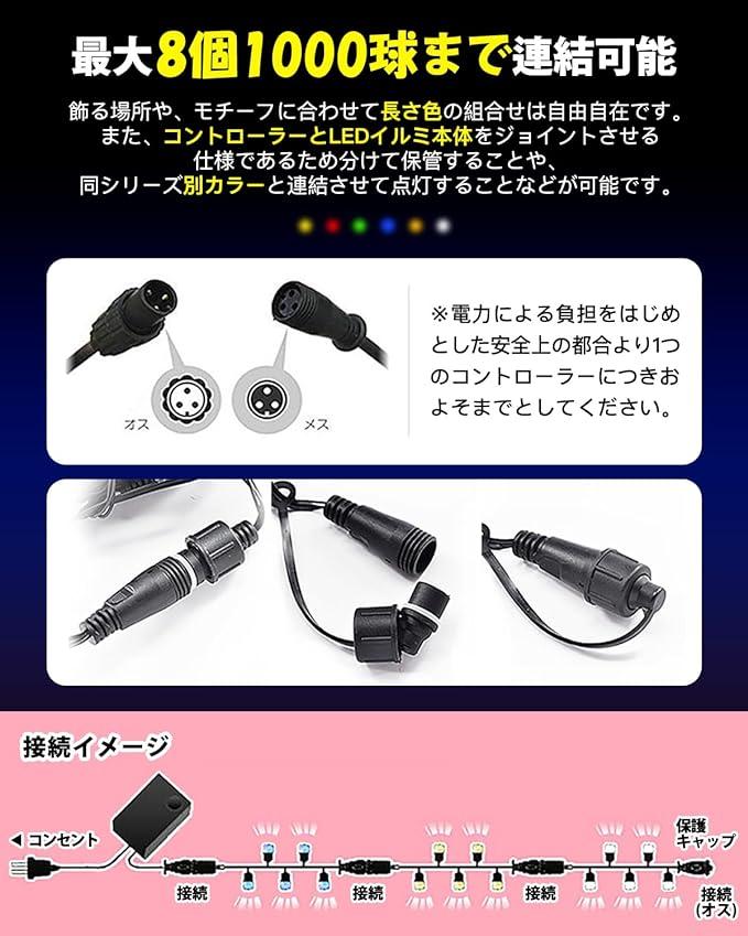 この商品について 【製品仕様】高輝度拡散型LEDチップ120球、コントローラー長さ:約1.5m、重量(約):700g、防水等級 :IP44(生活防水)ブラックコード、 【つらら仕様】24列。3-5-7-5の配列。30LED、50LED、70LED 【連結可能】1000球まで連結可能、メモリー機能付きコントローラー 8点灯パターン