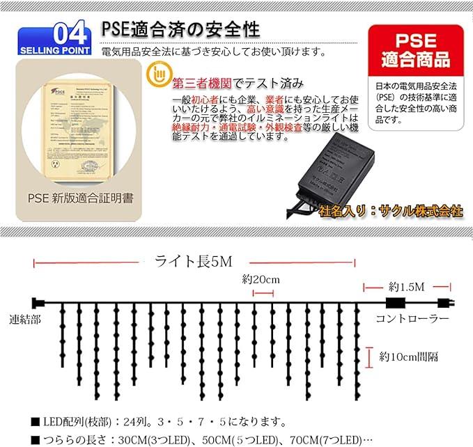 ■商品説明【製品仕様】高輝度拡散型LEDチップ120球、コントローラー長さ:約1.5m、重量(約):700g、防水等級 :IP44(生活防水)ブラックコード、 【つらら仕様】24列。3-5-7-5の配列。30LED、50LED、70LED 【連結可能】1000球まで連結可能、メモリー機能付きコントローラー 8点灯パターン
