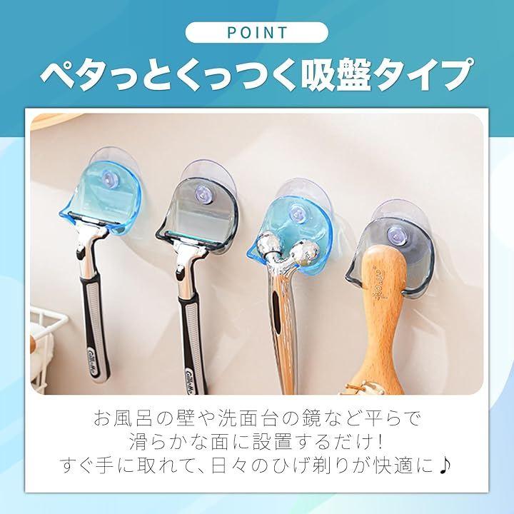 「ペタっとくっつく吸盤タイプ」お風呂の壁や洗面台の鏡など平らで滑らかな面に設置するだけ。すぐ手に取れて、日々のひげ剃りが快適に。