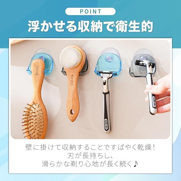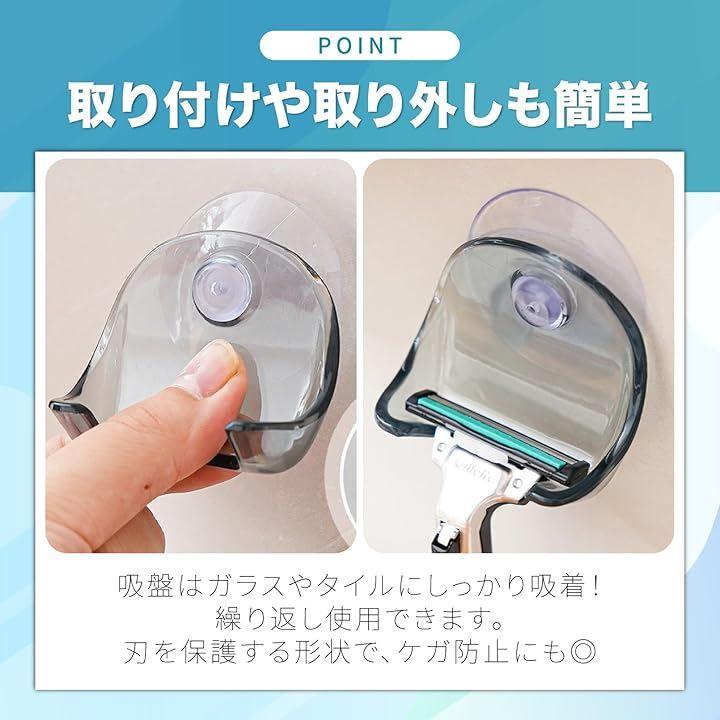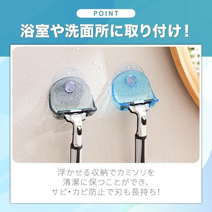 浮かせる収納でカミソリを清潔に保つことができ、サビ・カビ防止で刃も長持ち。カラーはブルーまたはグレーからお選びください。