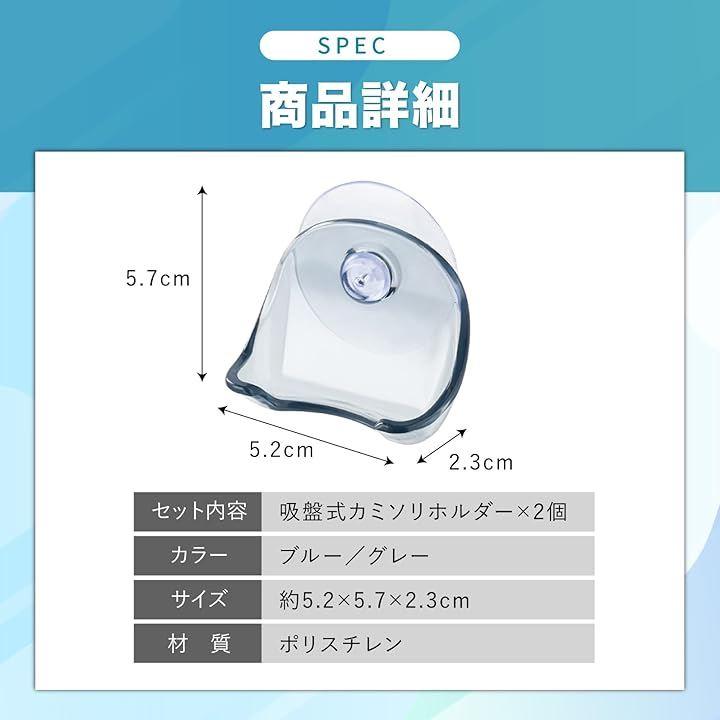 「商品詳細」セット内容:吸盤式カミソリホルダーx2個 カラー:ブルー/グレー サイズ:約5.2x5.7x2.3cm 材質:ポリスチレン *モニターの環境により、色の見え方に若干差が生じる場合がございます。