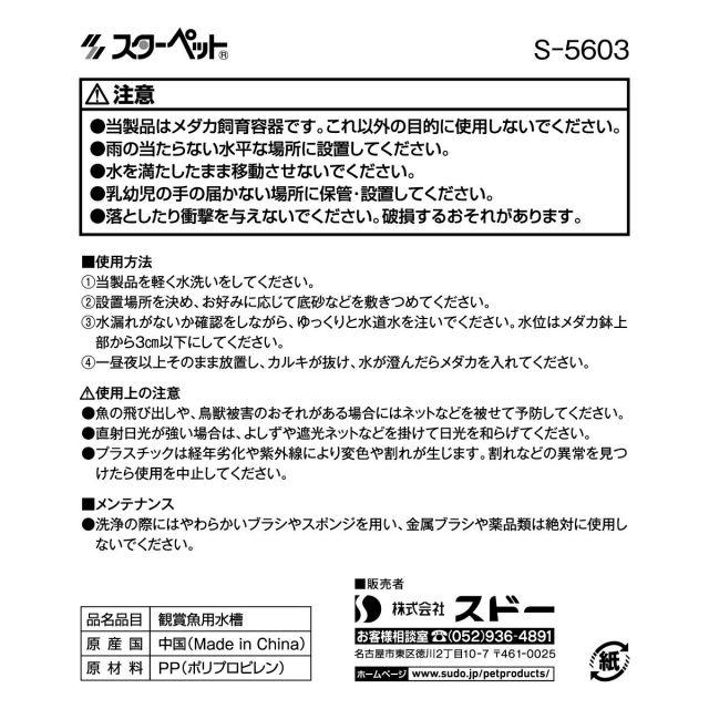 商品紹介エサを追いかけ、水草をつっつく…メダカたちがつくる波紋が水面に広がります。情趣に富んだみかげ石の斑模様を表現したメダカ飼育用の鉢です。使用上の注意・当製品はメダカ飼育容器です。これ以外の目的に使用しないでください。・雨の当たらない水平な場所に設置してください。・水を満たしたまま移動させないでください。・落としたり衝撃を与えないでください。破損する恐れがあります。【使用上の注意】・魚の飛び出しや、鳥獣被害のおそれがある場合にはネットなどを被せて予防してください。・直射日光が強い場合は、よしずや遮光ネットなどを掛けて日光を和らげて下さい。・プラスチックは経年劣化や紫外線により変色や割れが生じます。割れなどの異常を見つけたら原材料・成分ポリプロピレン使用方法1.使用前に当製品を軽く水洗いをしてください。2.設置場所を決め、お好みに応じて底砂などを敷きつめてください。3.水漏れがないか確認をしながら、ゆっくり水道水を注いでください。水位はメダカ鉢上部から3cm以下にしてください。4.一昼夜以上そのまま放置し、カルキが抜け、水が澄んだらメダカを入れてください。