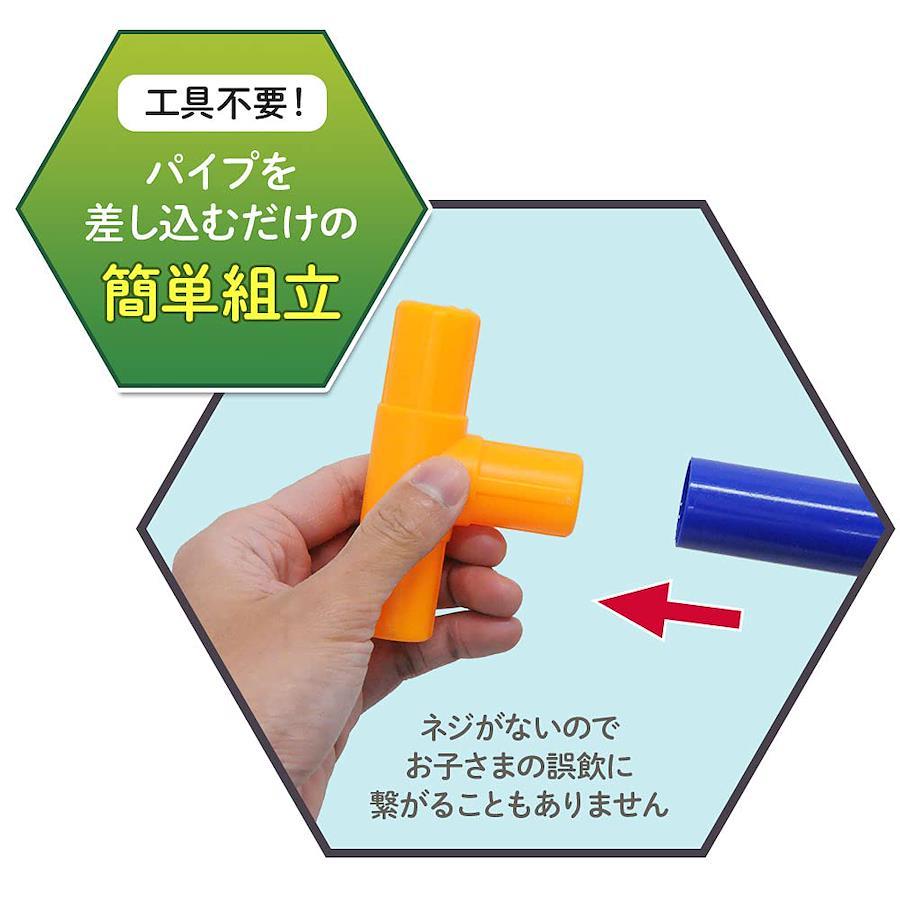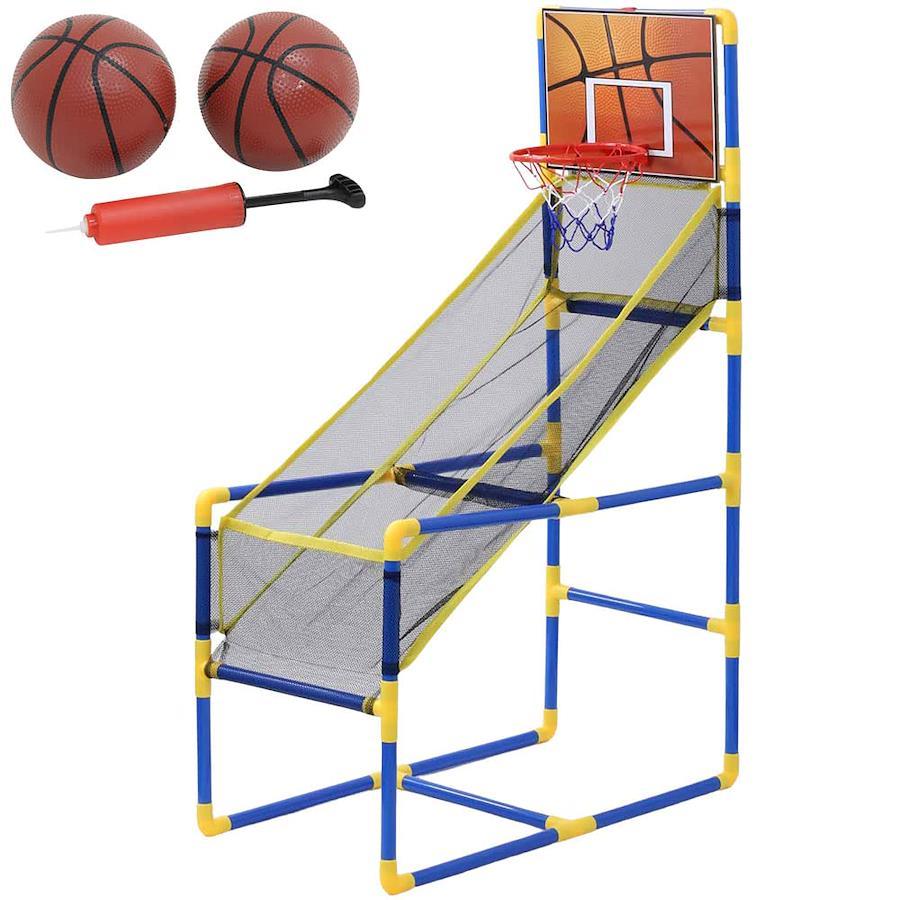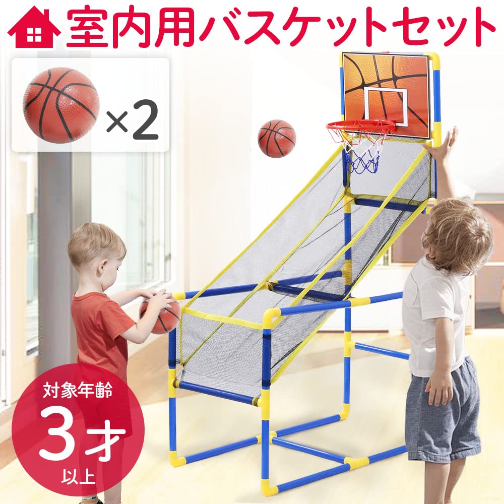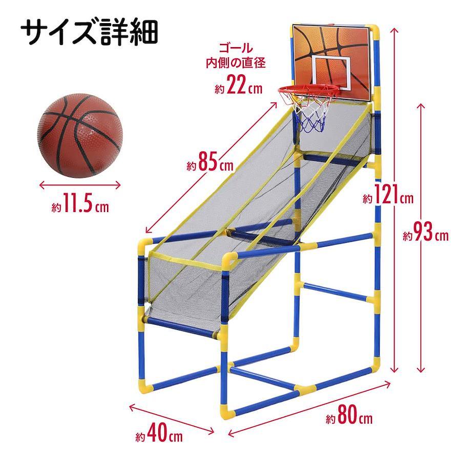 ボールとゴールがこれ1つですべて揃う!お子様が夢中になれるバスケットボールプレーセット。ボールとポンプが付属しているので、すぐに遊ぶことができます。ボールは2個付属で連続してシュート可能です。工具不要で組み立て可能。ブロックにパイプを差し込むだけなので簡単に組み立てられます。ネジがないのでお子さまの誤飲に繋がることもありません。フレームはプラスチック製で軽量かつ、ジョイント部分に角がないのでお子様がぶつかっても安心です。サイズ(約):本体/高さ121×幅40cm×奥行80cm、ゴール/内側直径22cm、ボール/11.5cm、手前からゴールまでの距離(約):85cmセット内容 : 本体×1、ボール×2、ポンプ×1対象年齢 : 3歳以上組立式【免責事項】メーカーによる商品リニューアルに伴いパッケージ(内容量も含む)変更が行われた場合、新パッケージでお届け致します事ご了承願います。