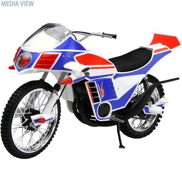 仮面ライダーV3の専用オートバイ、ハリケーン を1/12スケールで再現したプラスチックモデル組立キット。キットはエンジン部分、キャプレター、エアクリーナー、バッテリーも再現。エンジン周りは精巧なディテールが施され、カウルも非常に薄く仕上げています。赤と青のカラフルなカラーリングはデカールで再現可能。前後スポークホイールは、メッキ仕様で細いスポークも精密に再現。前後タイヤはゴム素材、トレッドパターンが前輪と後輪で異なります。