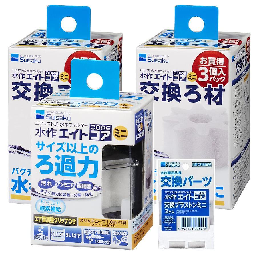※本製品は、別売のエアポンプと付属のスリムチューブを接続することで作動します。超小型 エアリフト式 水中フィルター 9点セット。水作エイトコアミニ(本体)、交換ろ材3P×2個(6個)、交換プラストンミニ(2個)。らくらくメンテナンス、すぐに交換できるセットです。サイズ以上のろ過能力、クリアな水を実現。たっぷり酸素補給。本体には、スリムチューブ1.0m、エア量調整クリップ付属。5リットル以下の小さい水槽用。1982 年の発売以来、ビギナーからプロユースまで幅広く支持されてきた水中フィルターのスタンダードモデルがフルモデルチェンジしました。ろ過能力などの基本性能はそのままにろ材の交換方法など更に使いやすくなりました。【サイズ】水作エイトコア ミニ:幅50 × 奥行き50 × 高さ55mm 【みずものコム限定 お試し おそうじパッド付き】 ※一部、パッケージがリニューアルして画像とは多少異なりますが、中身は同じものですのでご了承ください。