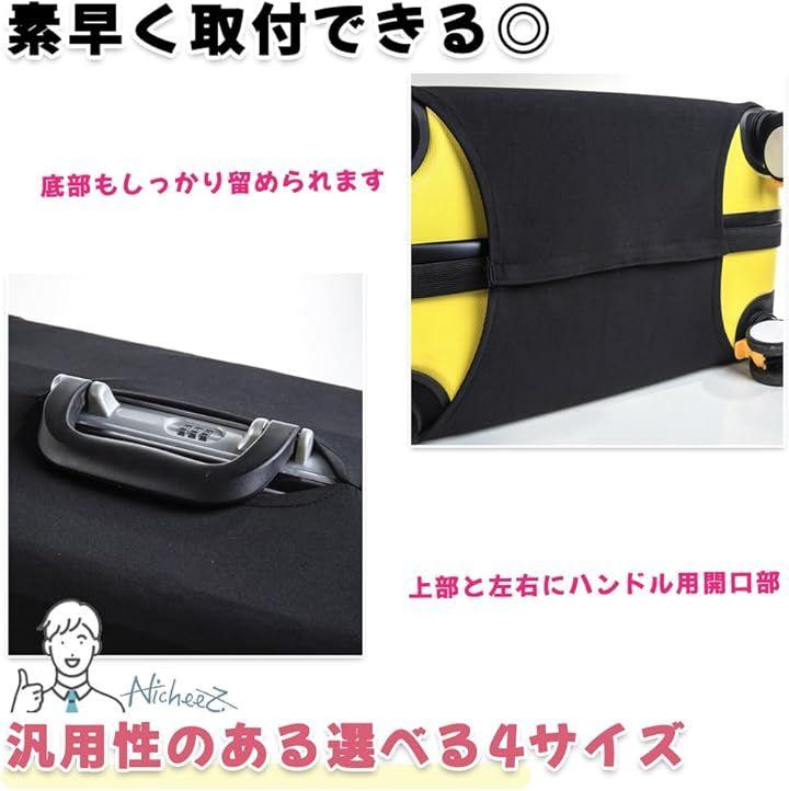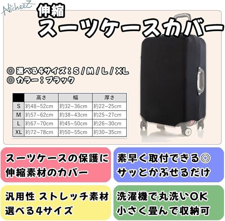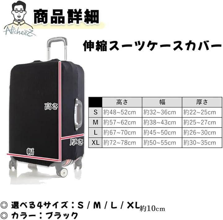 「商品内容」 伸縮スーツケースカバー カラー:ブラック Sサイズ:高さ/約48~52cm 幅/約32~36cm 厚さ/約22~25cm Mサイズ:高さ/約57~62cm 幅/約38~43cm 厚さ/約25~27cm Lサイズ:高さ/約67~70cm 幅/約45~50cm 厚さ/約26~30cm XLサイズ:高さ/約72~78cm 幅/約50~55cm 厚さ/約30~35cm