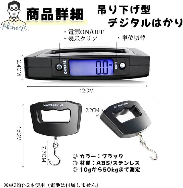 「商品内容」 吊り下げ型デジタルはかり 素材:ABS/ステンレス カラー:ブラック サイズ:幅/約12cm 高さ/約15cm 厚み/約2.4cm *単3電池2本使用(電池付属無)