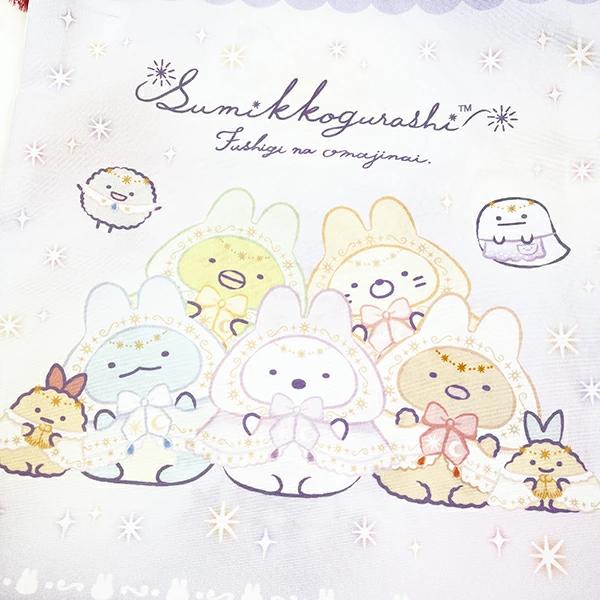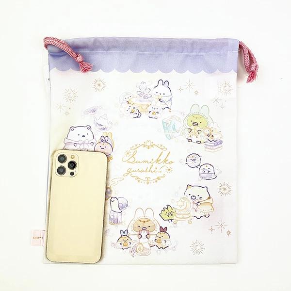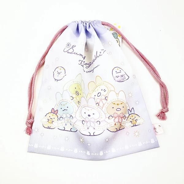 すみっコぐらしの巾着(中)です。学校に持って行くアイテムやお弁当を入れるのにもぴったり☆ぜひお子様やお孫様のお好きなキャラクターを選んでみてください♪