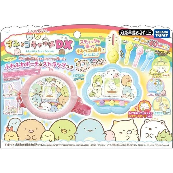 すみっコぐらし すみっコキャッチ DX スティックを使ってすみっコの世界に入りこむ!?専用スティックですみっコをつかまえたり、お世話できる液晶トイに、DX版が登場!スティックで操作する液晶「すみっコキャッチ」に付属品が付いたDX版が登場!(1)ふわふわポーチと専用ストラップ、(2)DXオリジナルデザインの着せ替えシート、(3)パスワードカードが同梱。ポーチはストラップ位置を変えて斜め掛けや首掛けが可能、すみっコキャッチを可愛く持ち運べるよ。※本体の仕様(ゲーム内容含む)は従来品「すみっコキャッチ」と同じです。■3種類の専用スティックを差し込んで、すみっコをつかまえよう!スティックを動かすと画面と連動するよ。■ハンドスティックやごはんスティックで"わな"をしかけて、出てきたすみっコをアームスティックでゲット!■140以上のすみっコ&みにっコが登場! つかまえてコレクションしよう。■お世話遊びもスティックで♪ ごはんやおそうじのほか、おふろで体を洗ったり、お部屋のもようがえもできるよ。■アームスティックですみっコを部屋から連れ出して、色んな所におでかけもできちゃう!■一日のおわりにはすみっコたちとの「おもいで」ノートがこうしんされるよ。■クッキング機能ですみっコたちのごはんを作ることもできるよ♪■スティックを使って遊ぶミニゲーム6種収録!【セット内容】すみっコキャッチ本体(1),リバーシブルきせかえシート(両面)(2),スティック アーム(1),スティック ハンド(1),スティック ごはん(1),取扱説明書 A3両面(1),ふわふわポーチ(1),本体接続用リング付ひも(1),ふわふわポーチ用ストラップ(1),パスワードカード(1),スティック用ストラップ(1),