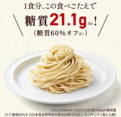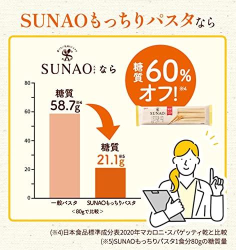 通常1-5営業日で発送◇おいしい?つづく?適正糖質!※? 食事が楽しいと、無理なく続く、結果につながる! ※1 「食・楽・健康協会」は、1食で摂取する糖質量を20~40g、間食は10g以下にする「適正糖質」を提唱しています。◆「SUNAO」においしい、そんな適正糖質パスタができました。SUNAOもっちりパスタ1食の糖質量21.1g※2、糖質量60%OFF※3! ※2 SUNAOもっちりパスタ1食分80gの糖質量 ※3 日本食品標準成分表2020年版マカロニ・スパゲッティ乾と比較?SUNAOもっちりパスタ デュラム小麦粉と、もち大麦粉の独自の配合バランスで、もっちり食感を実現。しっかりとした食べごたえながらも、糖質を21.1g※に抑えました。※SUNAO パスタ1 食分80gの糖質量?おいしく食べるコツ ・標準ゆで時間8分・大きめの鍋と、たっぷりの湯を用意してください。(目安は、1束80gのパスタに、湯1L) ※塩を入れる必要はありません。 ※鍋が小さく浅いと、パスタがはみ出て、焦げる場合がありますので、ご注意ください。 ・ゆであがりましたら、水気を切り、あたたかい内にお召し上がりください。ゆで後は麺同志がくっつきやすくなりますので、お早めにソースとあえてください。【重要】メーカーによる商品リニューアルに伴いパッケージ(内容量も含む)変更が行われた場合、新パッケージでお届け致します事ご了承願います。