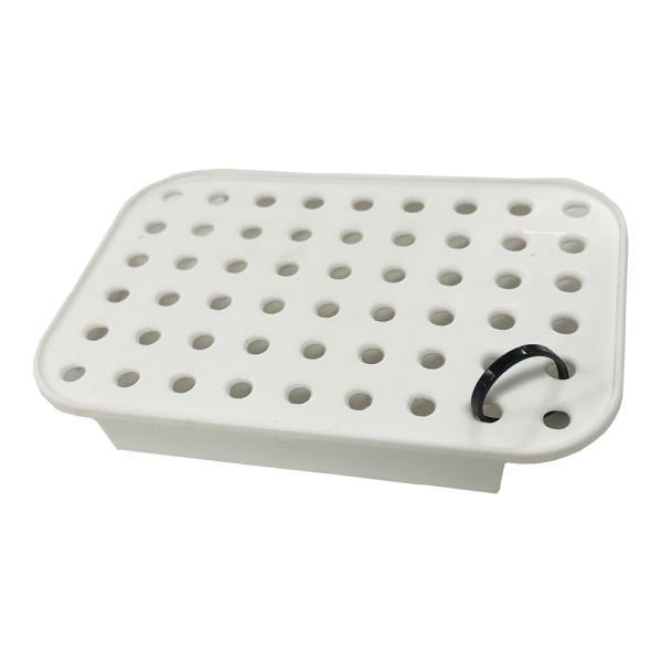 サシエを取り出しやすい前開き構造です。フタ部がトレイになり、使いたい分だけをサシエを小出しできるため、エサ付けが手返しよくスピーディーに行えます。溶けたエサから出た水分が切れるスノコ付。バッカンにセットしたままフタのファスナーが閉められるショートフック仕様。■カラー:ホワイト■サイズ:W130×D87×H70