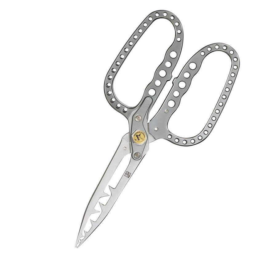長年愛され続けた「宝刀うおばさみ」を素材・仕様を徹底的に見直し、フルモデルチェンジを果たした松山うおばさみ。掴んだ魚が暴れた際も手が痛くならないようハンドルは計算されたR 形状へ進化。うおばさみ本体素材に超軽量・高強度を両立したジュラルミンを使用。本体重量が約98g になり扱いやすくなりました。四式はうおばさみ本体に専用の鈎外し、ナイフ、ミニプライヤーをセットした現場型の特別仕様です。※使用後は腐食を防ぐ為に、真水で海水を洗い流し風通しの良い日陰で乾燥してください桐箱入。