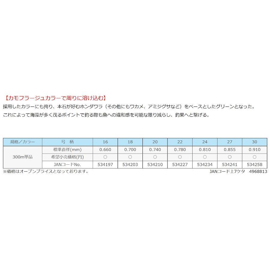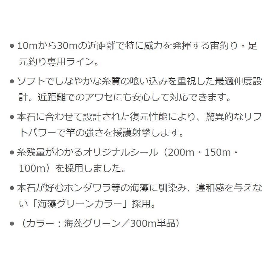 驚異的な復元力でパワーを封じ込める本石鬼憧10mから30mの近距離で特に威力を発揮する宙釣り・足元釣り専用ライン。ソフトでしなやかな糸質の喰い込みを重視した最適伸度設計。近距離でのアワセにも安心して対応できます。本石に合わせて設計された復元性能により、驚異的なリフトパワーで竿の強さを援護射撃します。糸残量がわかるオリジナルシール(200m・150m・100m)を採用しました。本石が好むホンダワラ等の海藻に馴染み、違和感を与えない「海藻グリーンカラー」採用。